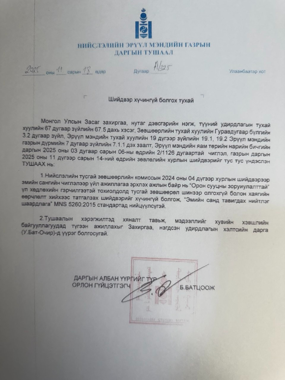 Эмийн сангийн чиглэлээр үйл ажиллагаа эрхлэх ажлын байранд өөрчлөлт орсон тушаал 2025оны 11-н сарын 18-ны А/325 тушаал